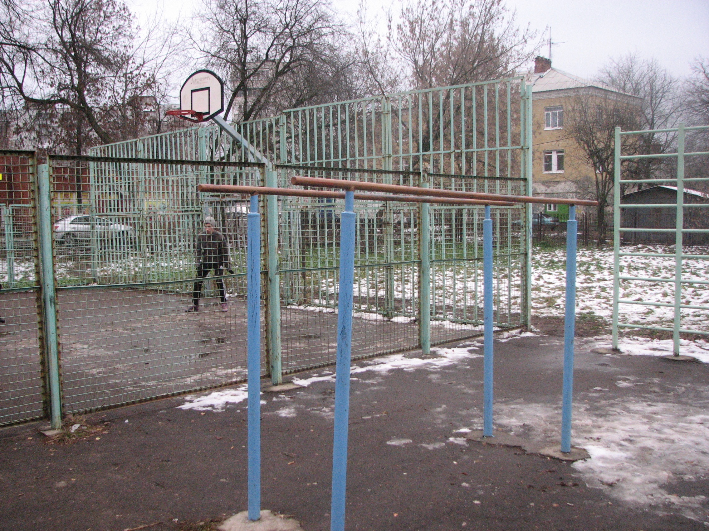 очень удобная площадка, 3 турника с разной высотой, не очень широкие.Лесенка для рук. Брусья тонкие, не очень широкие.Также имеется шведская стенка