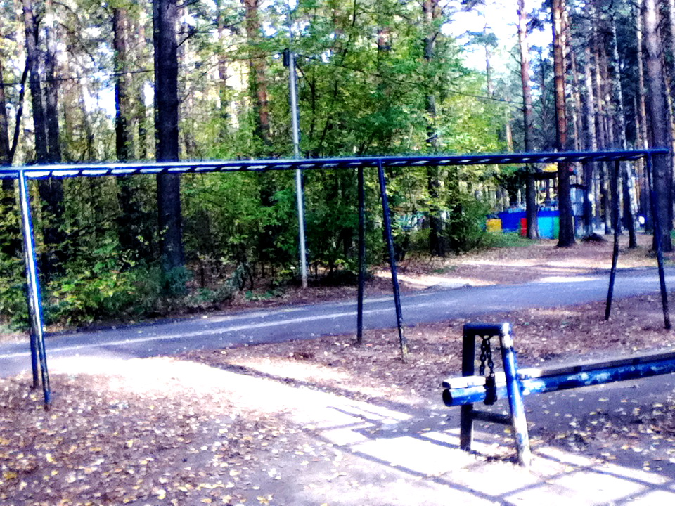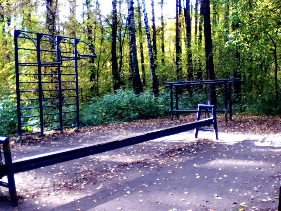 На площадке имеются основные снаряды для занятий уличной гимнастикой: турники, брусья, шведская стенка.