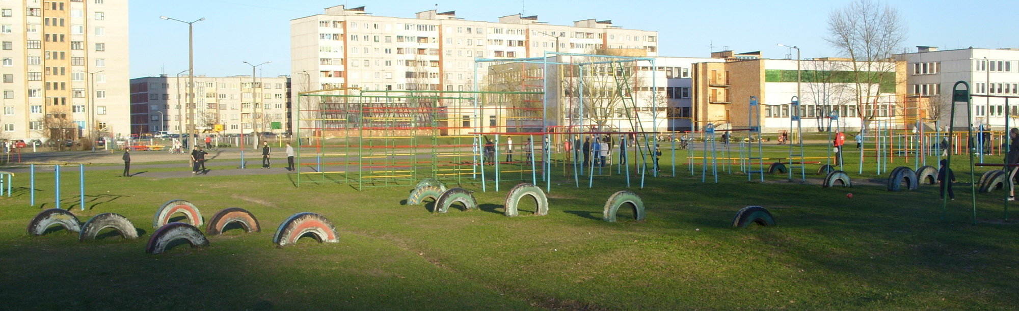 Площадка огромная. Сразу на две школы. Куча всего. Но всё старое и кривое. Брусья любой ширины и высоты. Турники любой кривизны