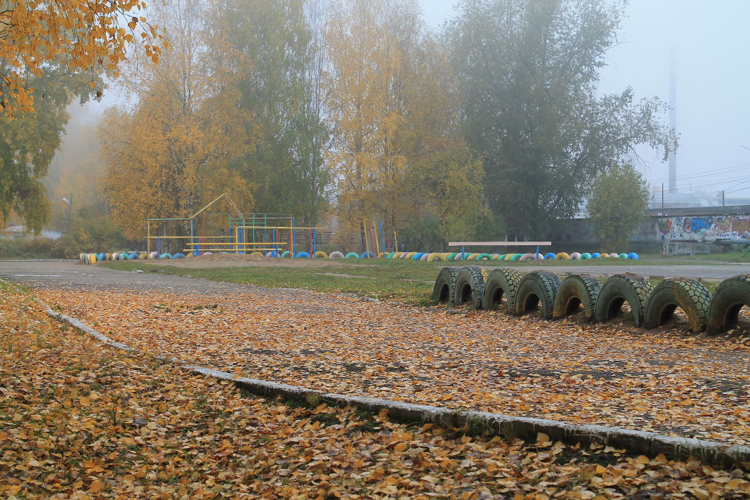 Спортивная площадка времен СССР - турники, рукоход, две пары брусьев, станина для прокачки пресса, беговая дорожка.