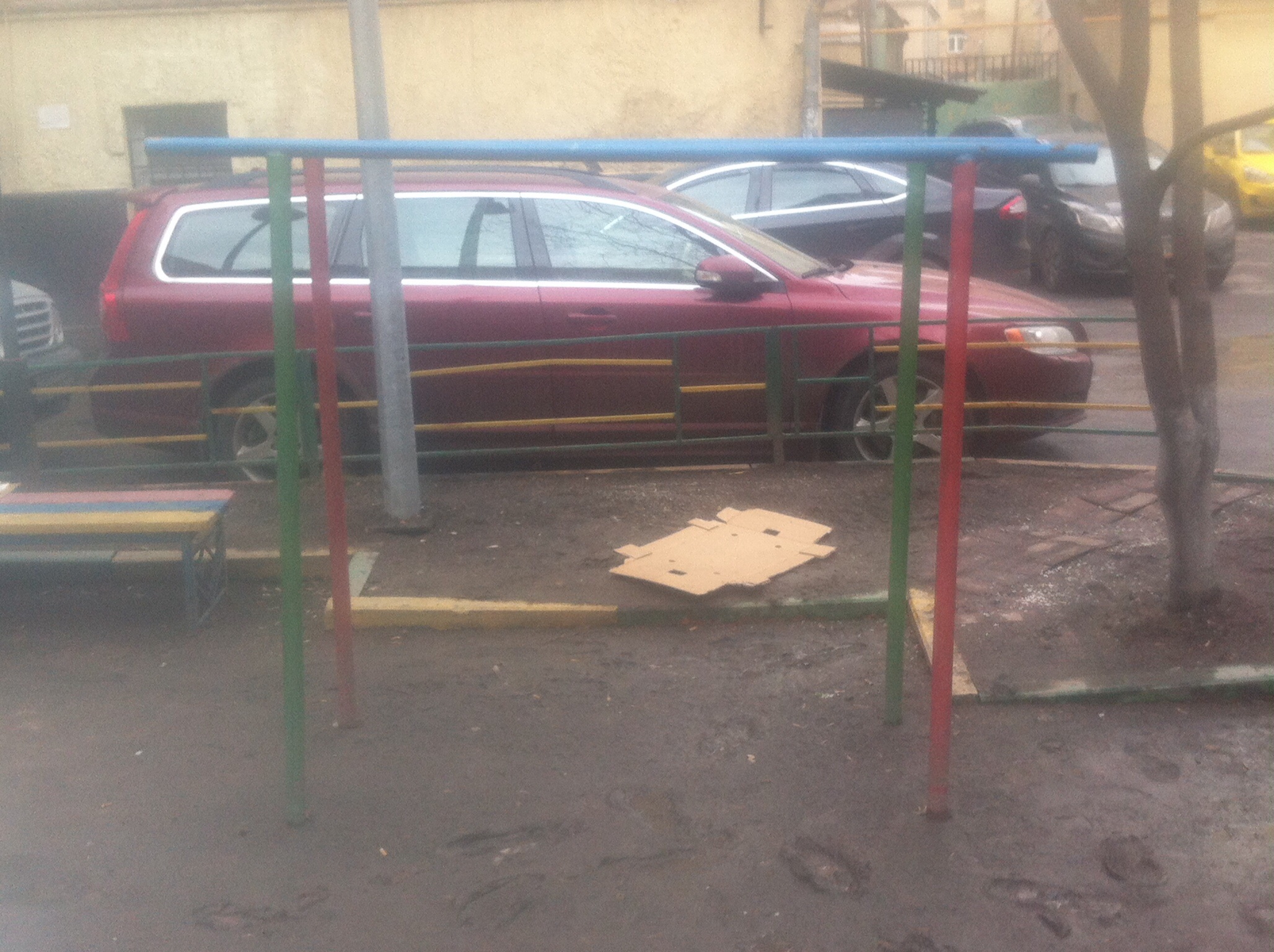 На площадке есть турник, брусья, уличная шведская стенка