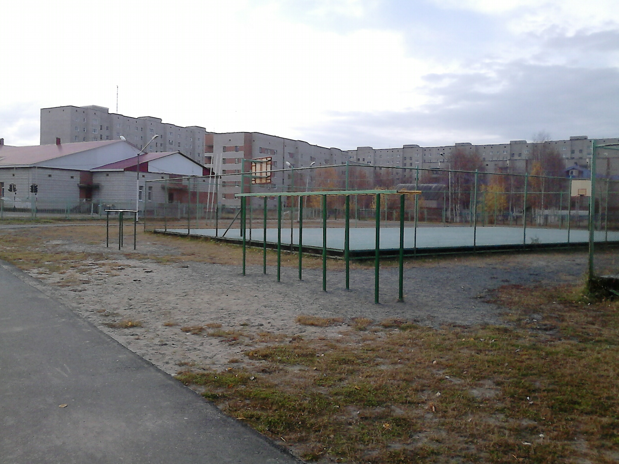 Специализированной площадкой для занятий Workout, данную площадку назвать трудно, но тем не менее есть все необходимое, а именно беговая дорожка, 2 турника один повыше, один пониже, брусья, шведская стенка.