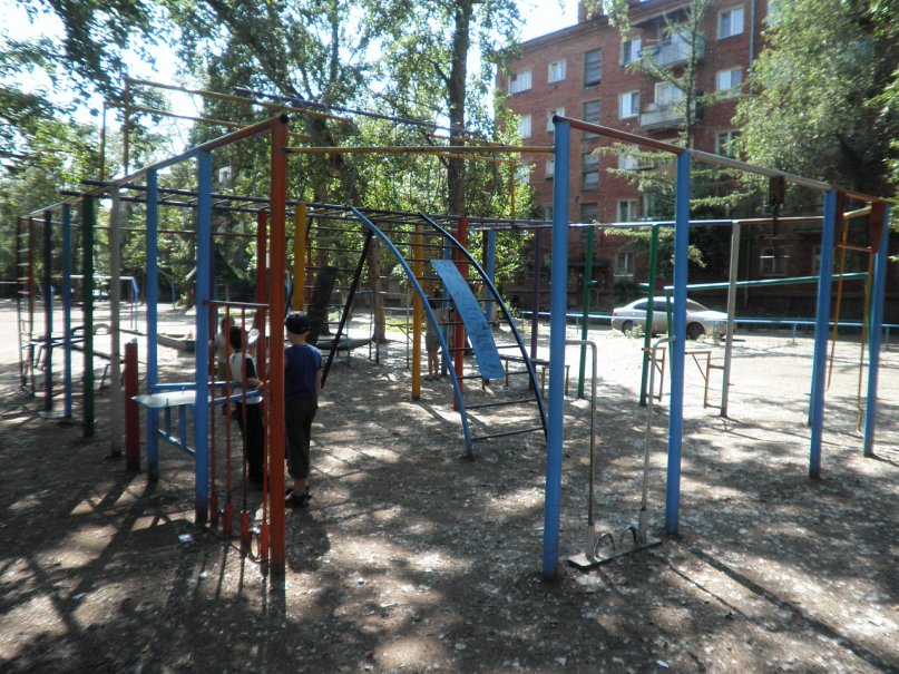 Площадка в одном из дворов рядом с общежитиями Омского политеха и автодорожной академии. Очередной комплекс, сохранившийся с советских времён. Минусом является то, что уж больно много лишнего и реально можно использовать лишь турник и две металлических ручки, заменяющих брусья.