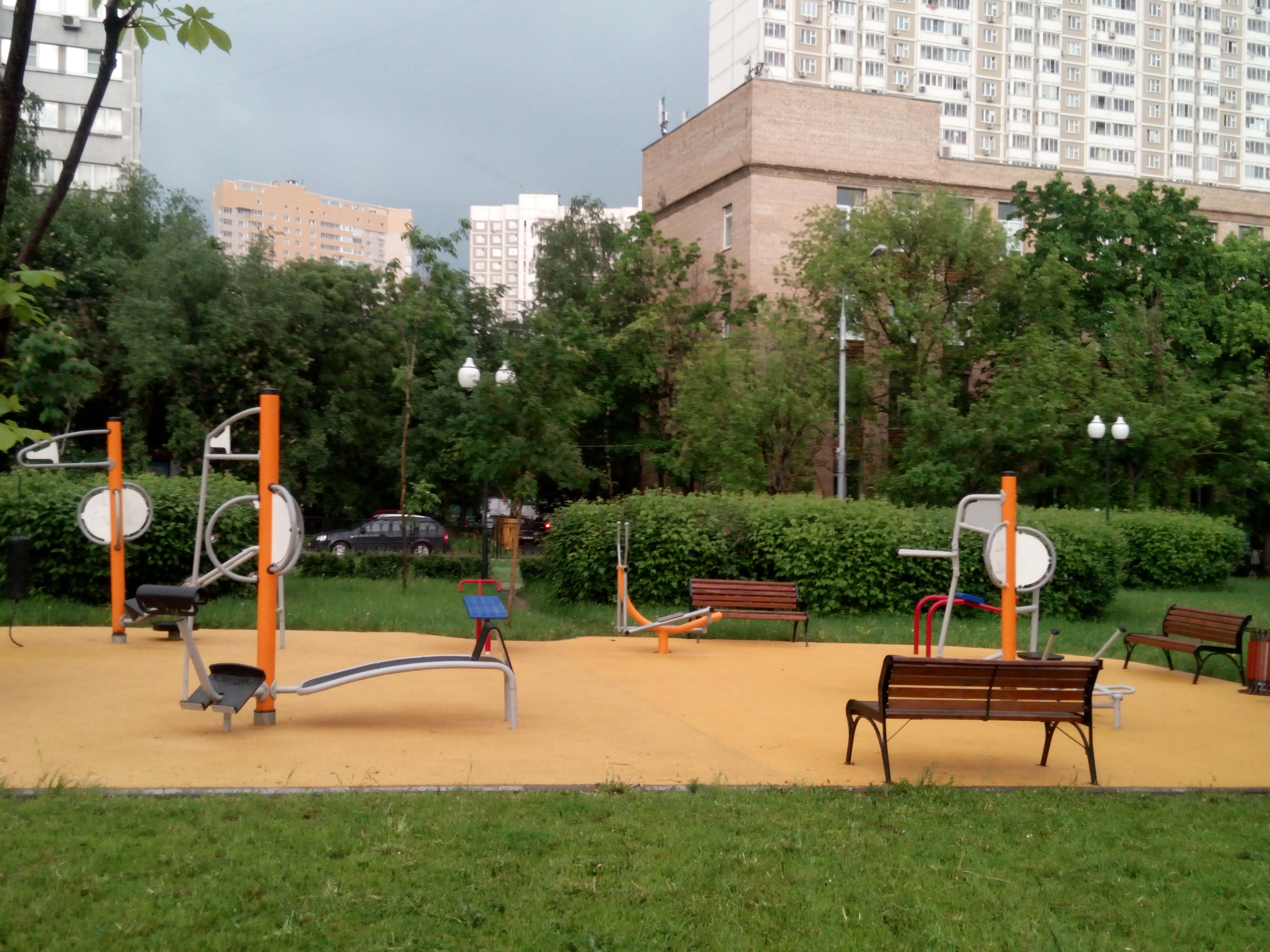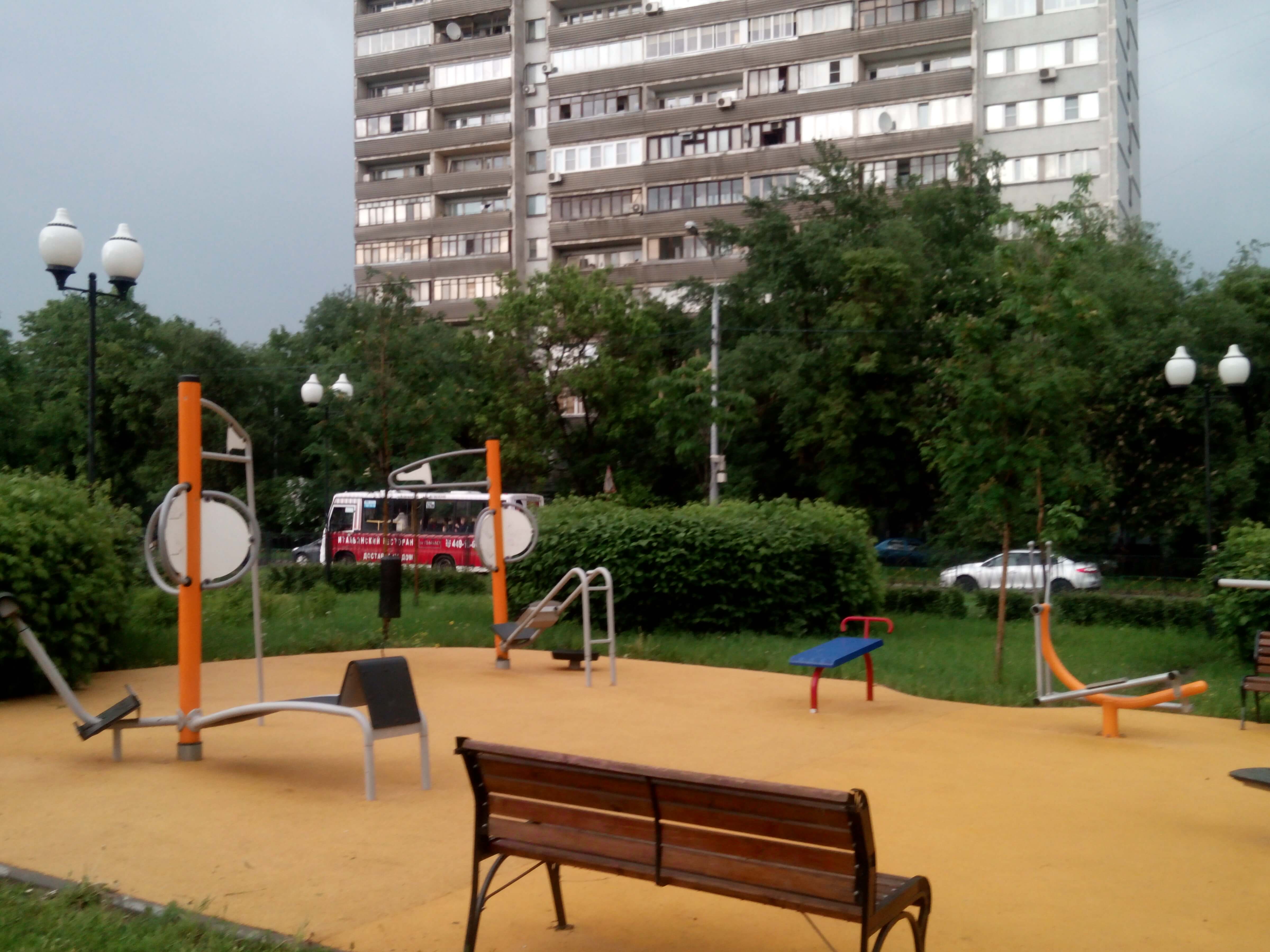 Уличные тренажеры. Площадка расположена на сквере. Полноценных турников и брусьев нет.