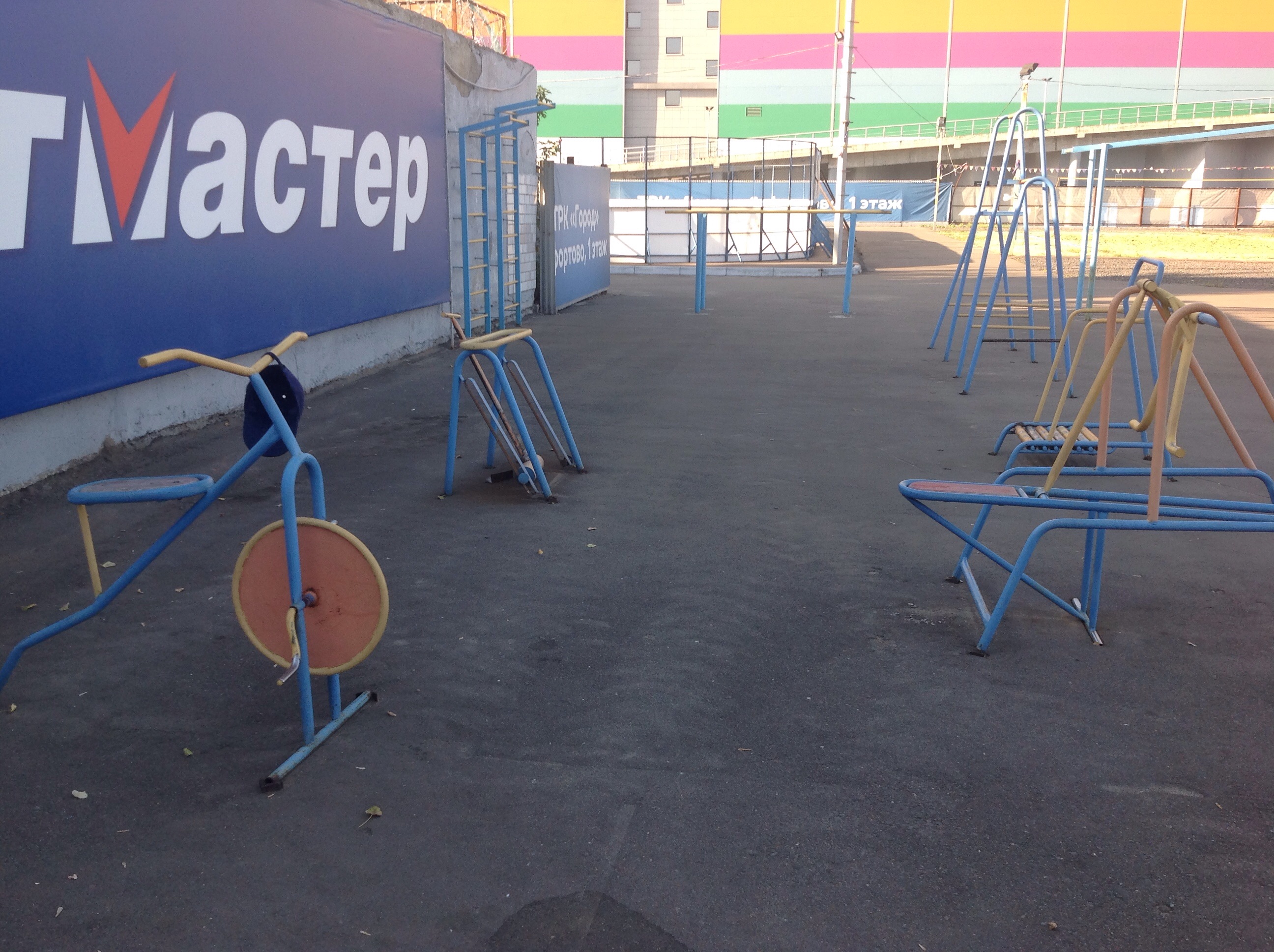 Много всяких непонятных тренажеров, некоторые уже порядком проржавели. Брусья, рукоход, турники, покрытие - асфальт. На мой взгляд, яркий пример того, какой площадка не должна быть. Хотя место потенциально очень хорошее.