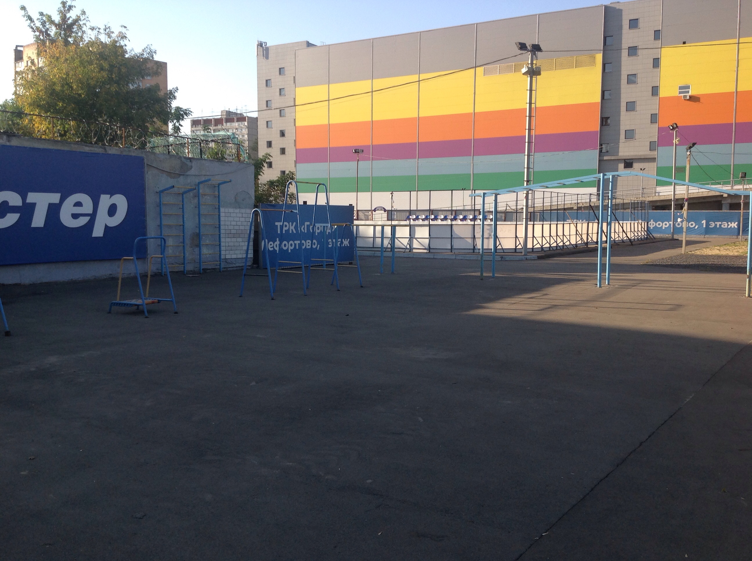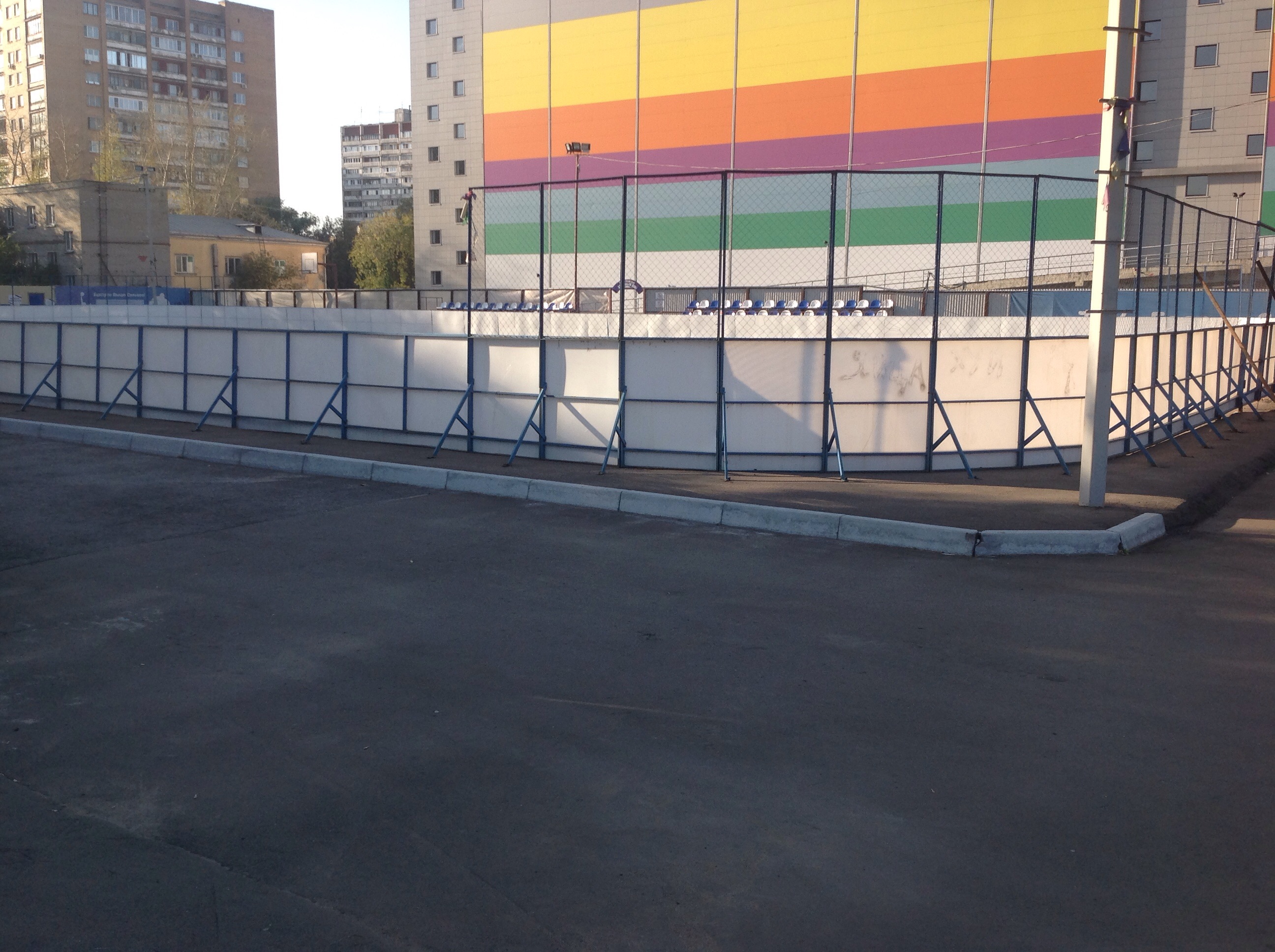 Соседствует с теннисным кортом, гибридом хоккейной коробки и баскетбольной площадки, площадкой для пляжного волейбола.