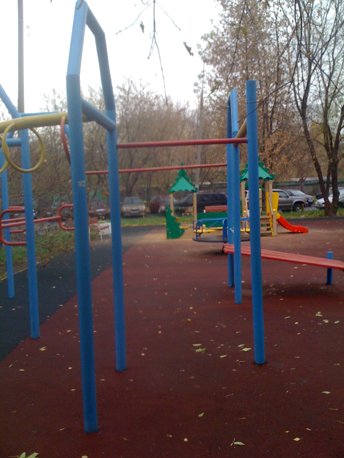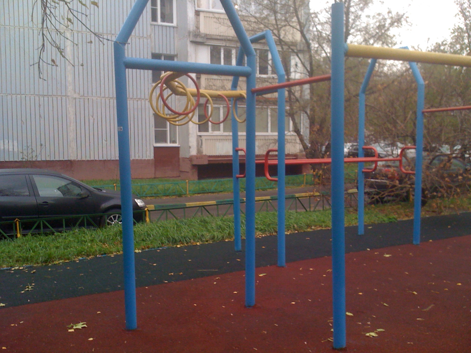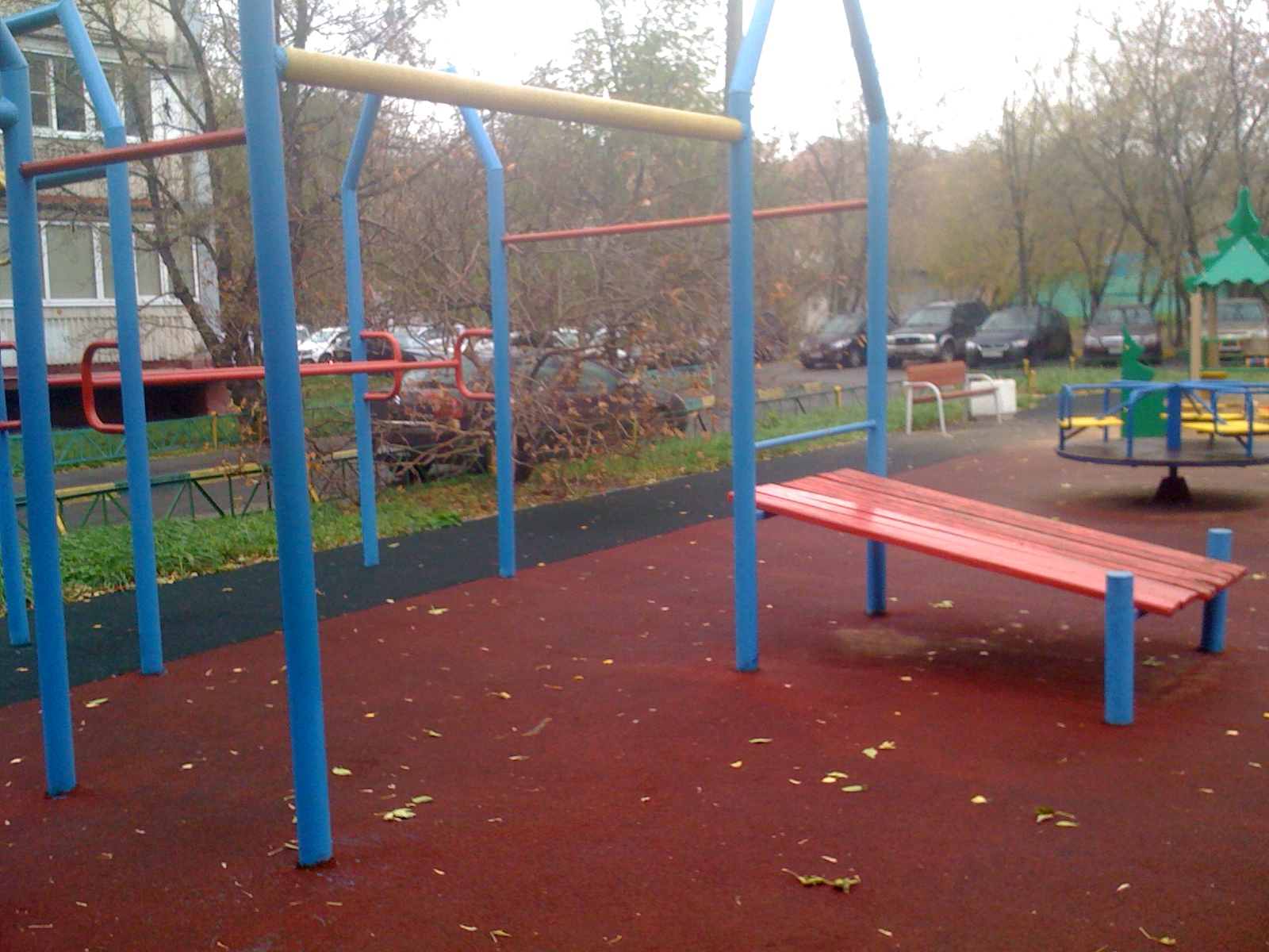 Хорошая площадка с ровным резиновым покрытием, толстым турником и мощными брусьями: отвечает всем правилам 100-дневки (по крайней мере для базового блока)