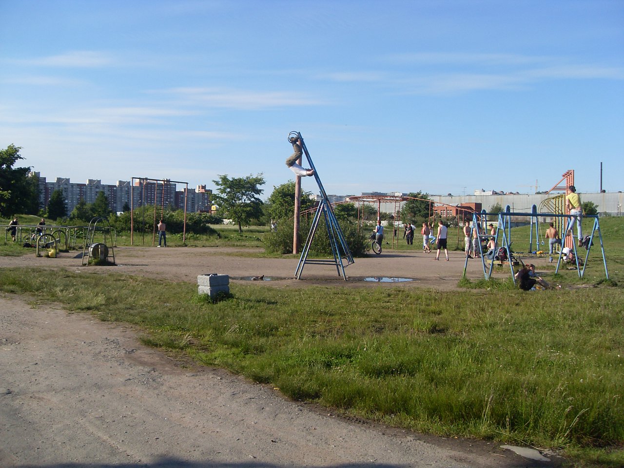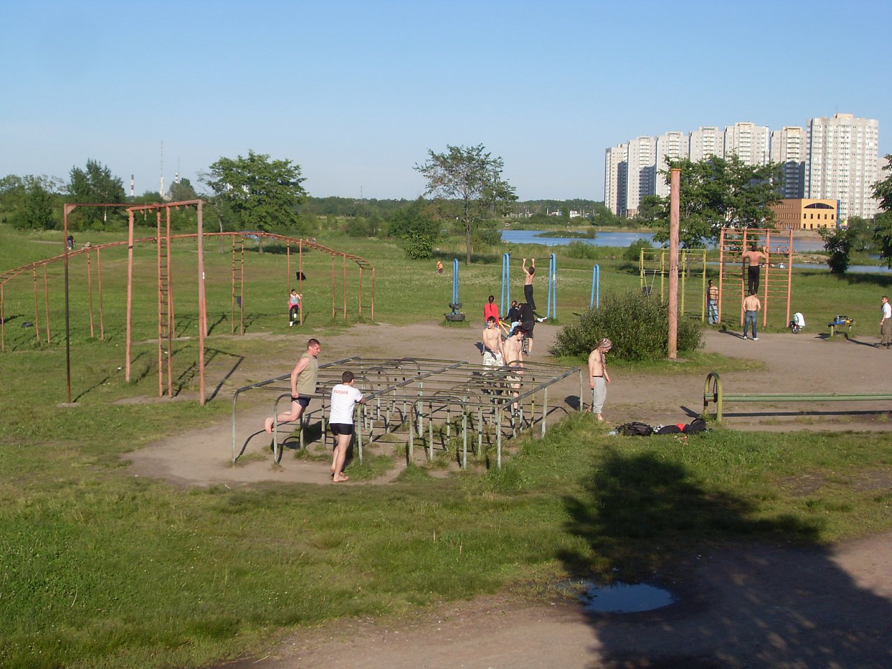 Был там сегодня 29.08.2015. С тем, что изображено на фотографиях мало общего. За 4 года мало что осталось, а то, что осталось пригодно разве что для подтягивания и отжимания. Имеется лишь одна перекладина, ради которой я и ехал туда, ибо остальные снаряды меня не сильно интересовали, брусья так вообще есть в каждом дворе, а вот с перекладинами куда хуже, одни детские площадки с недоперекладинами. Так вот она гнута дальше некуда, плюс вращается, ибо оторвалась в местах сварки. Есть "живые" шведские стенки, брусья-лабиринты, но, видимо, за давностью лет они просели вместе с грунтом, и выглядят как-то не торт.