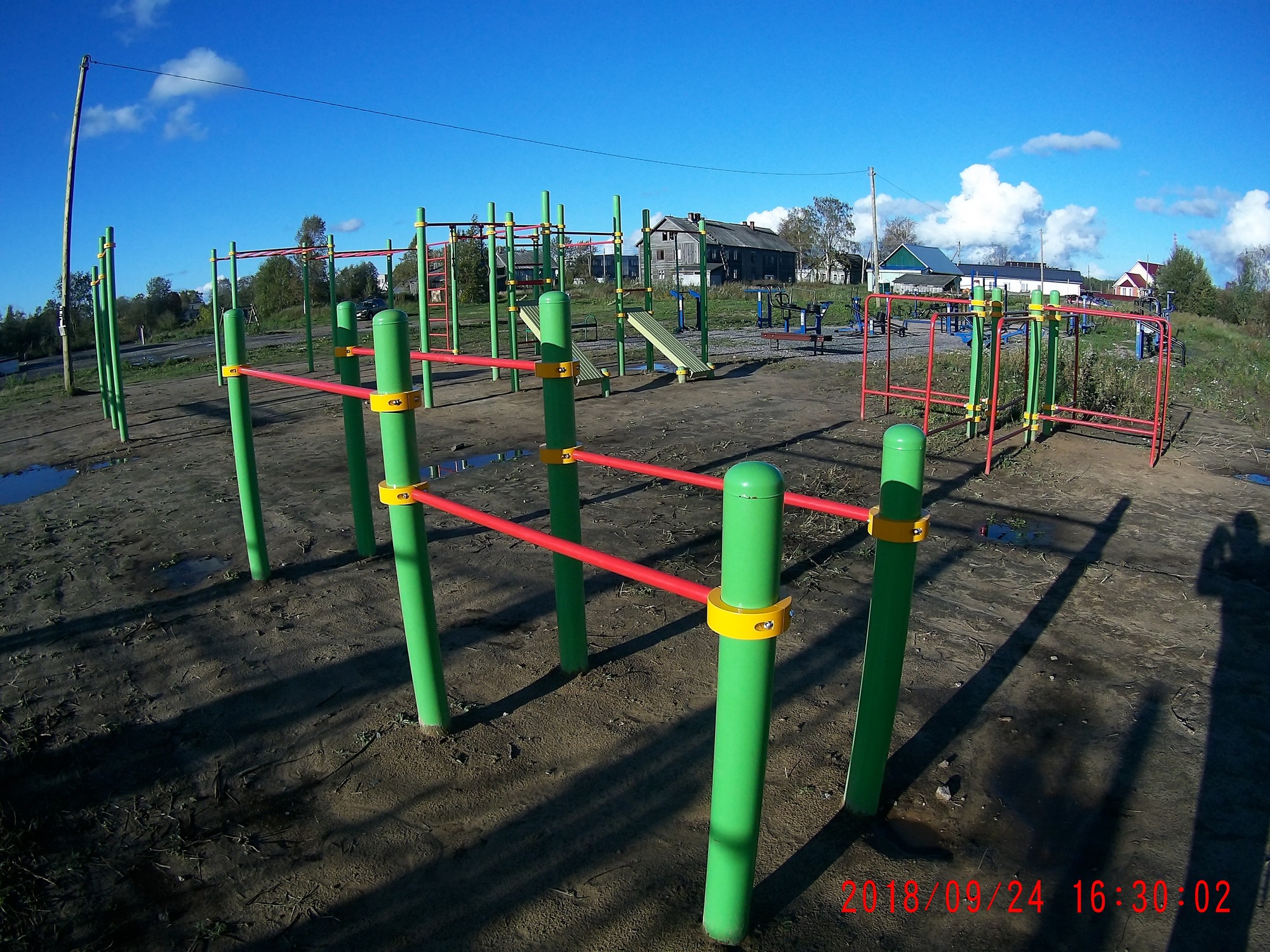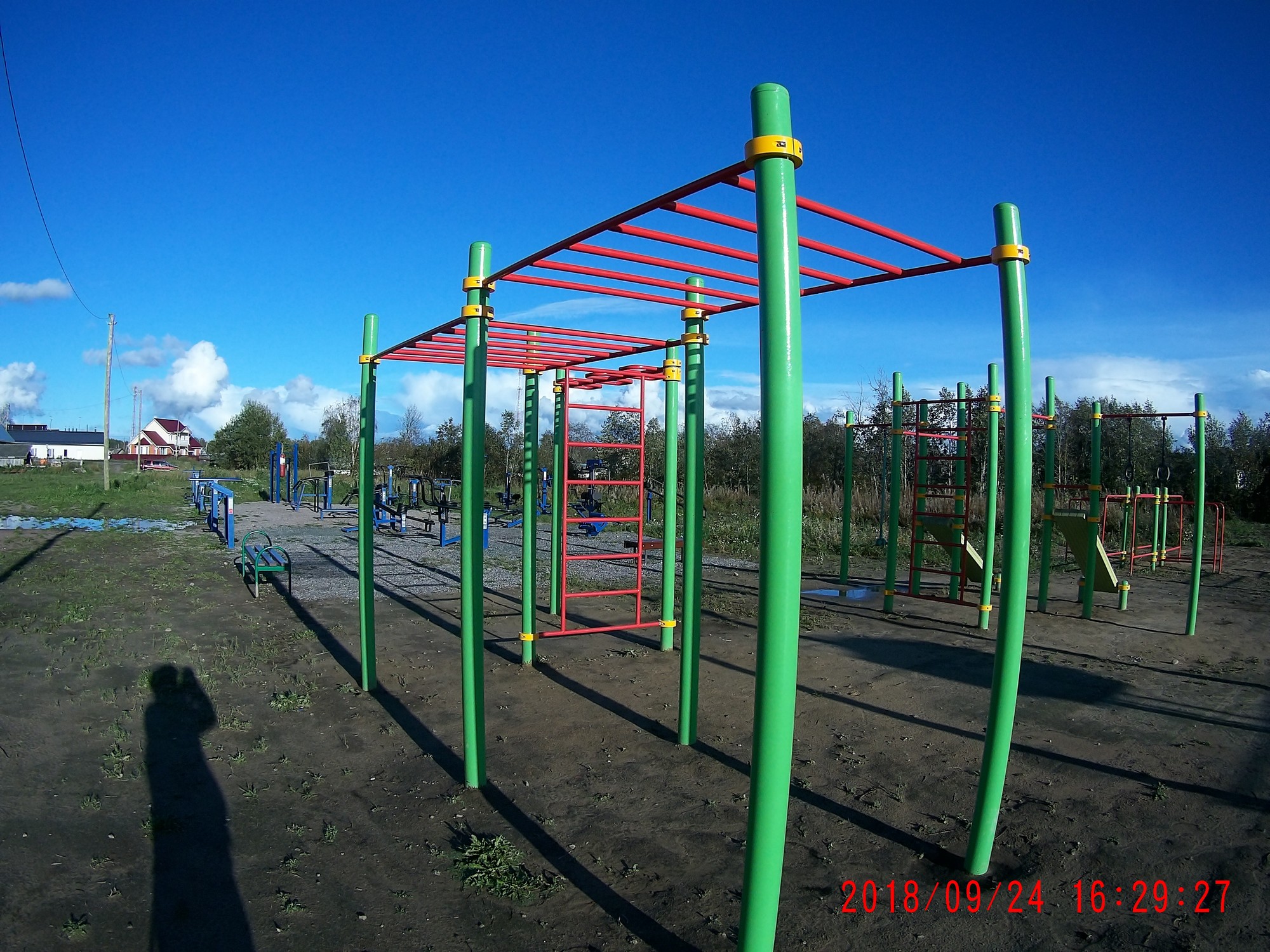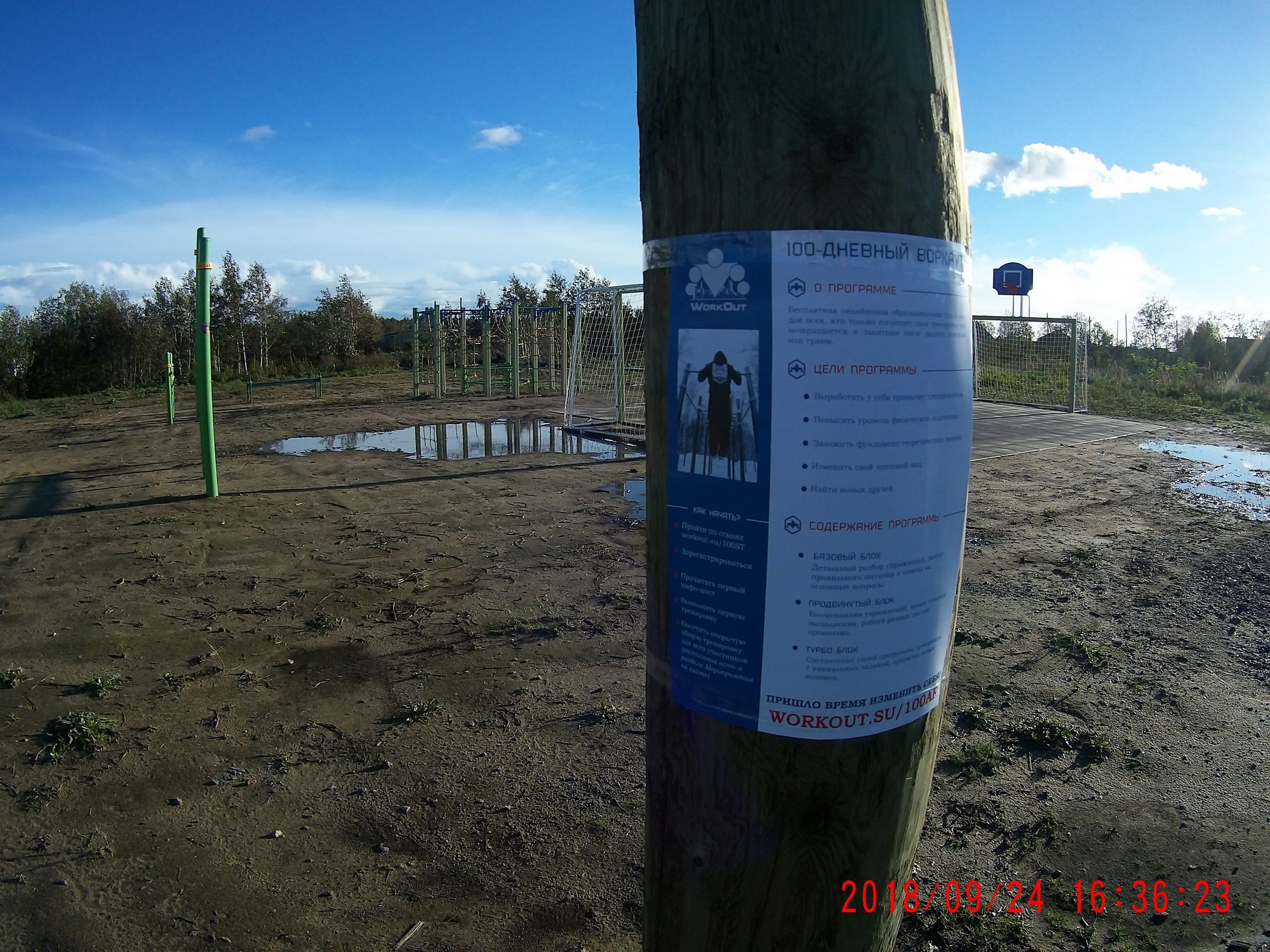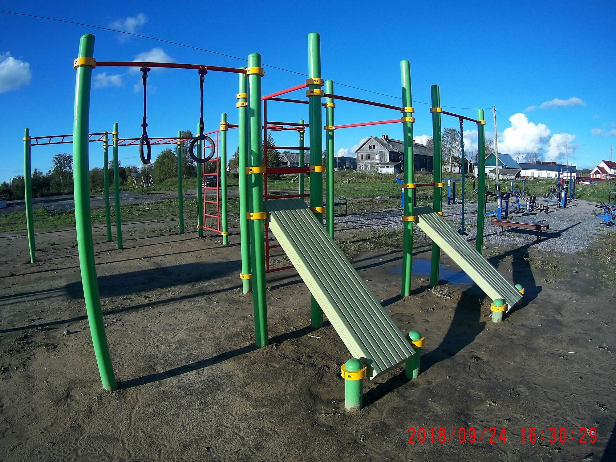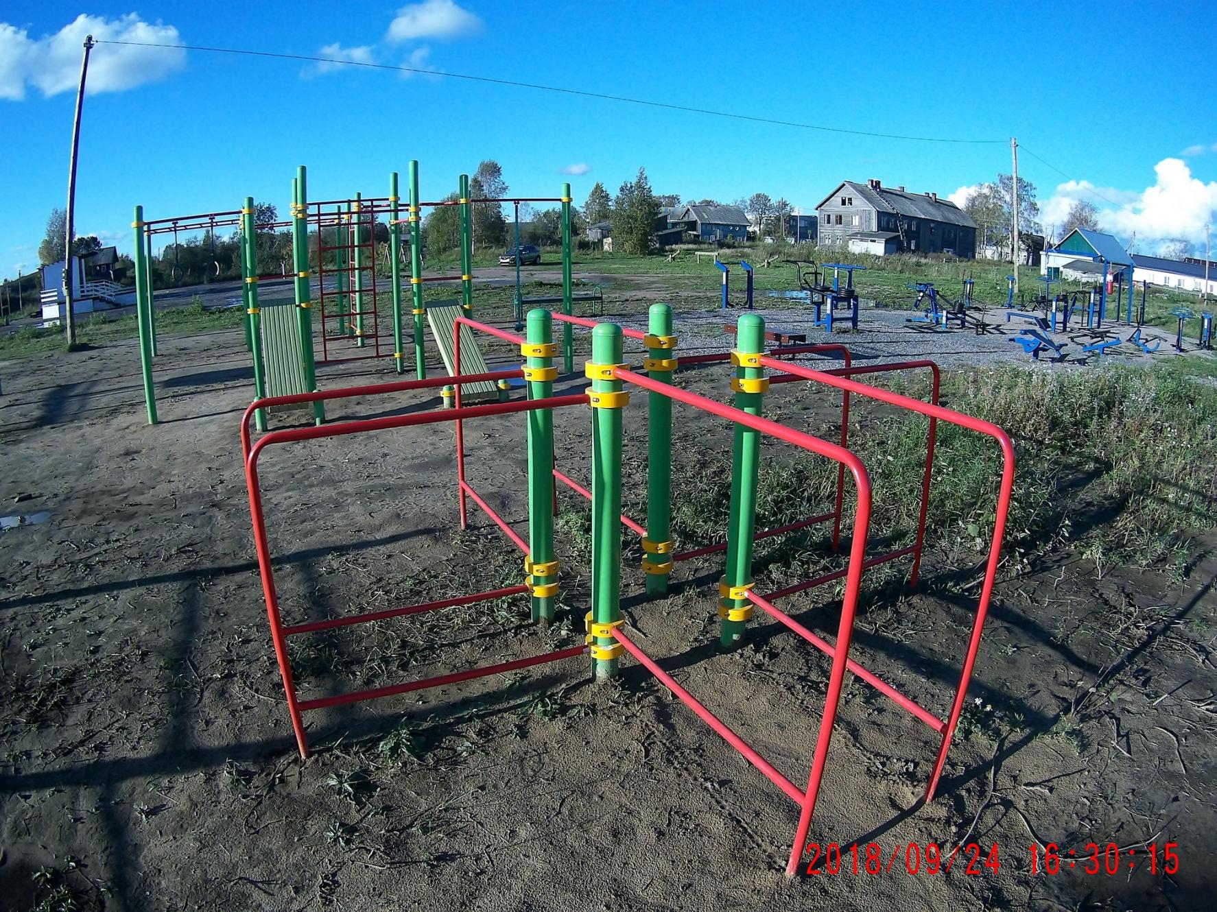 Рядом есть баскетбольно-футбольная мини-площадка с покрытием, ма-аленькая детская "лазалка" и три ряда тренажеров Маркелова.